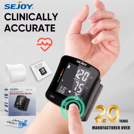 Il misuratore di pressione da polso Sejoy è progettato per offrire misurazioni rapide e affidabili della pressione sanguigna e della frequenza cardiaca direttamente a casa tua o in viaggio.